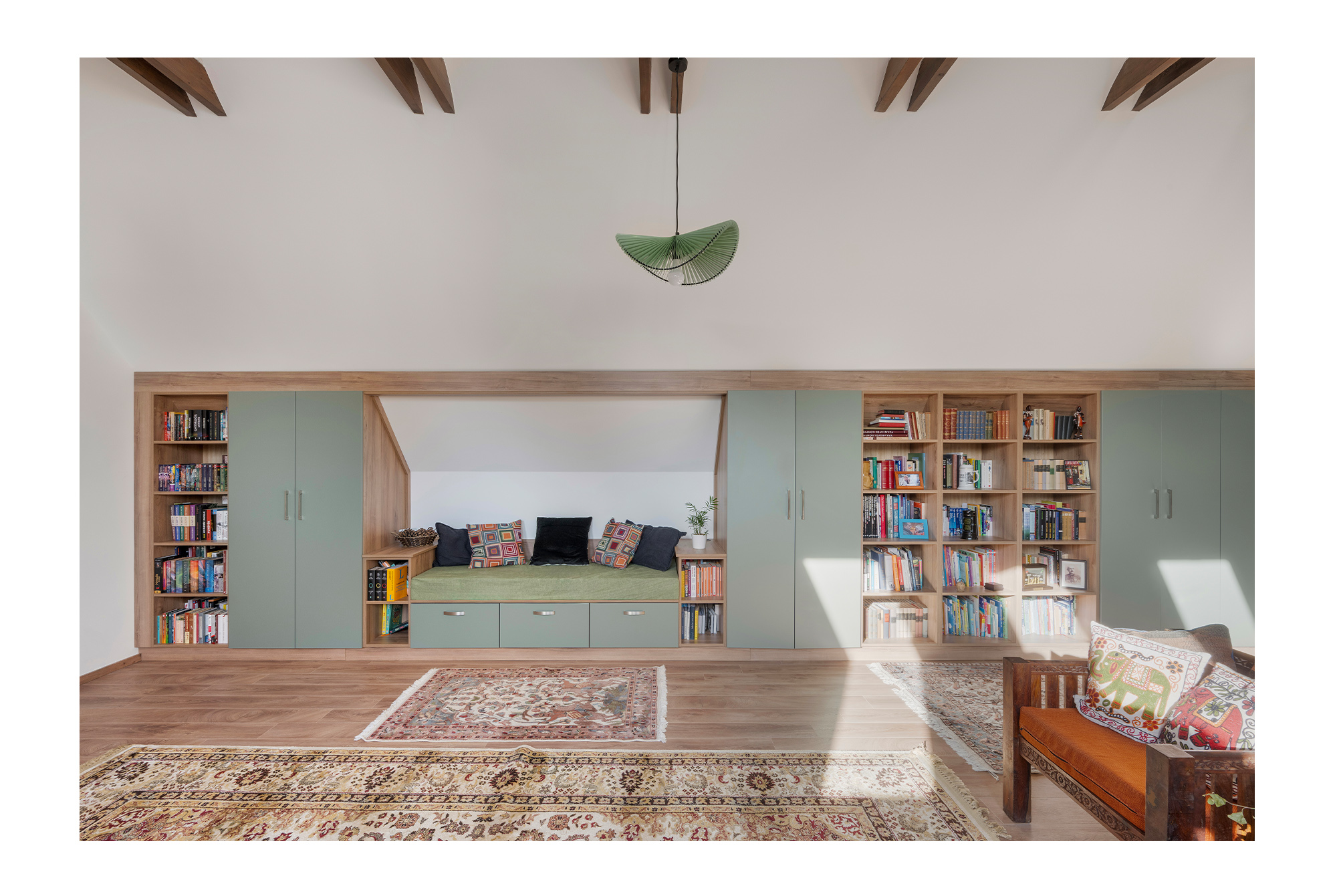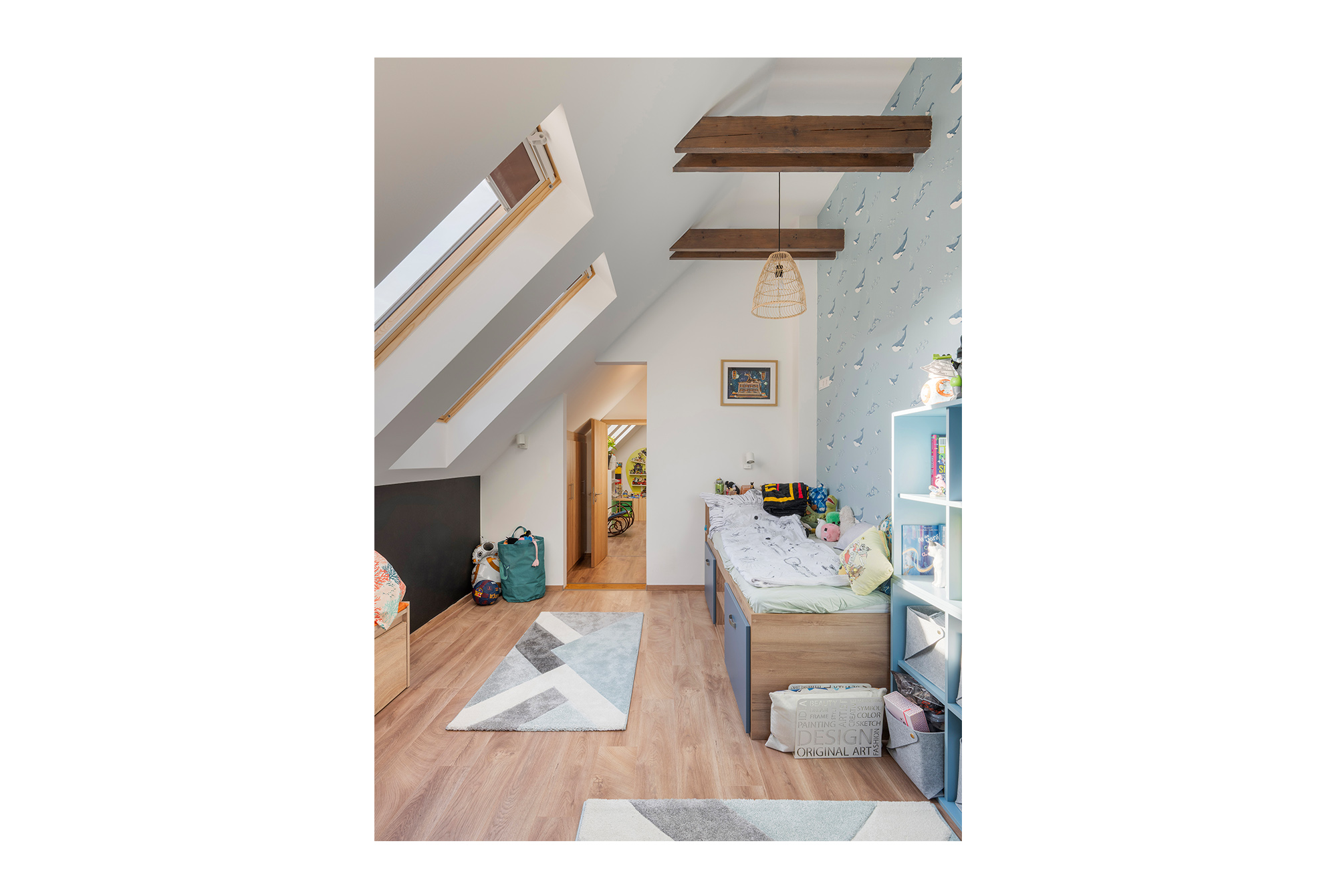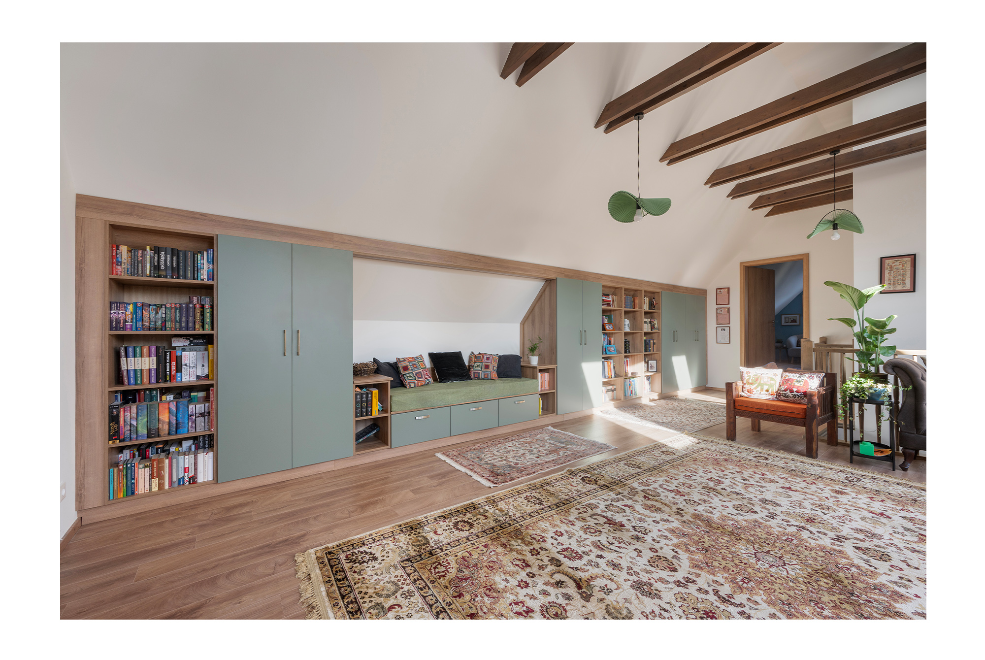 A belsőépítészeti átalakítása a földszinten a konyhát, a mosdót és a dolgozószobát érintette, a tetőtérben a meglévő gyerekszobát, a szülői hálót és a dühöngőt.