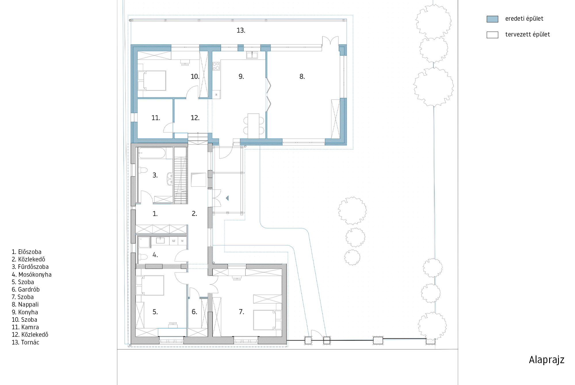 A megrendelő kérésére a 100 éves épület megóvása és bővítése volt a cél, így a tervezést különféle állagvédelmi vizsgálatok előzték meg, min például faanyagvédelem, falkutatás, alapfeltárás és szerkezeti vizsgálatok. Tervezési koncepciónk az utólagos hozzáépítések elbontása és egy új épületrész hozzáadása, amely a hátsó kertre néz. Az így létrejött U alakú épület egy belső udvart hoz létre, amely a megérkezés helye, illetve nagyobb intimitást biztosít a hátsó kert számára. Az új épületrészben került elhelyezésre a nappali, ami a kert felé egy tornáccal képez átmenetet.