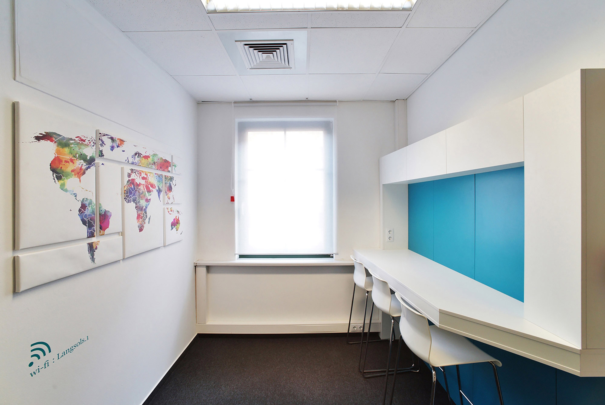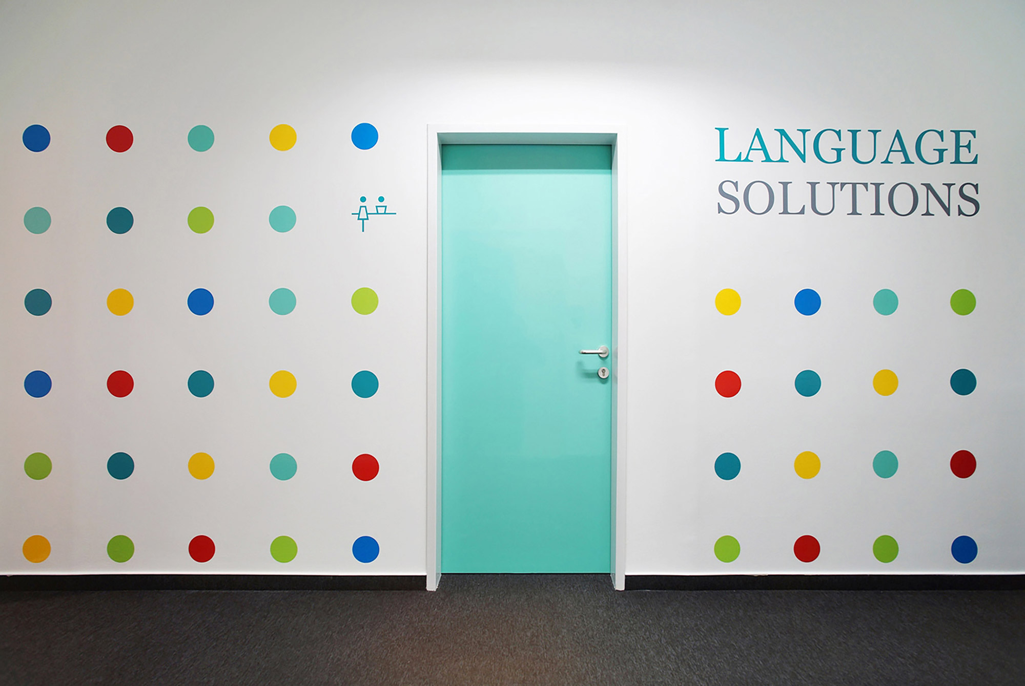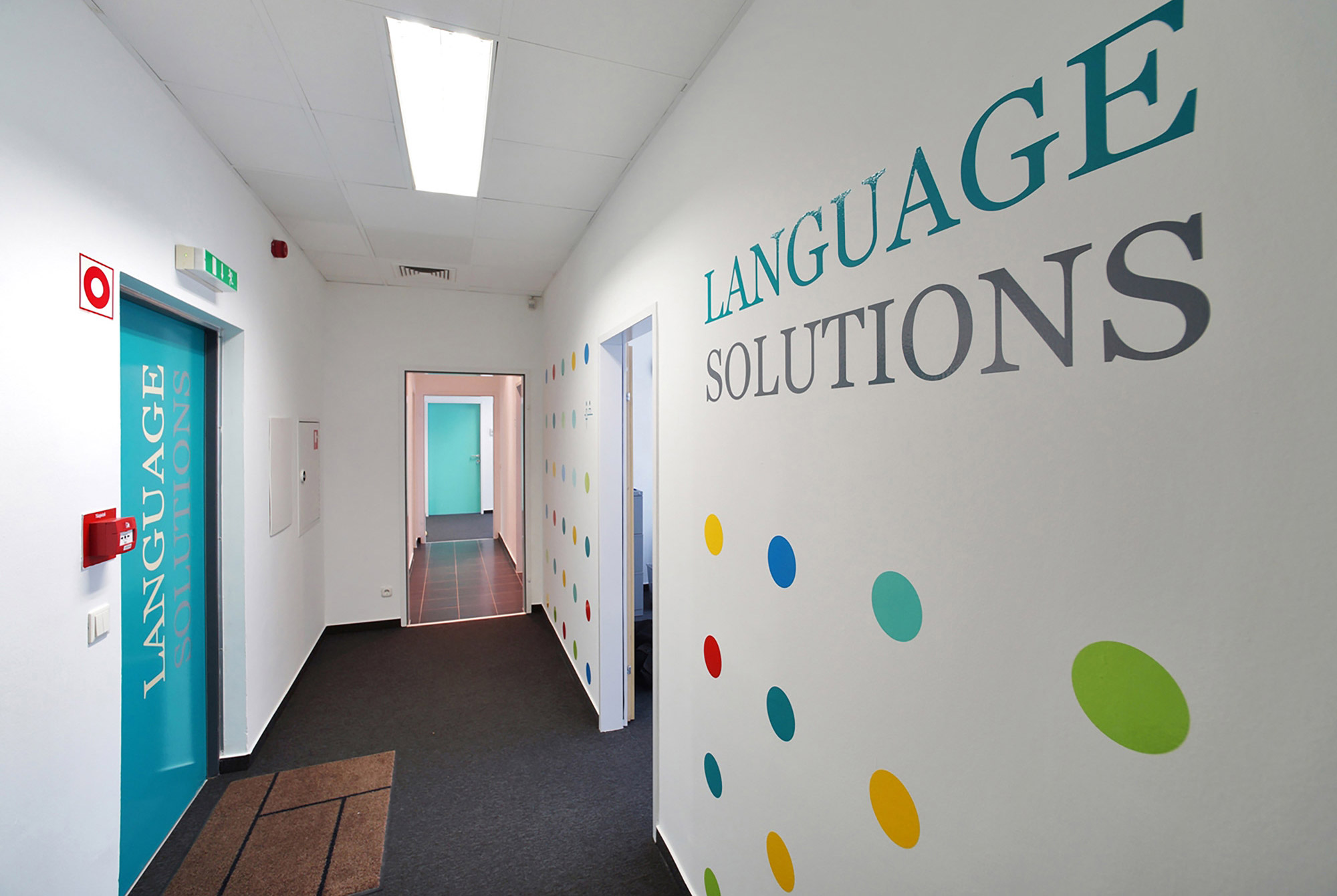 Egy nyolcvanas évekbeli irodaház bérelt helyiségeit hangoltuk a mai igényekre belsőépítészeti és arculati szempontból, egy soknemzetiségű, fiatalokat megszólító nyelviskolában. A helyszín jó példa arra, hogyan lehet kevés beavatkozással, a színek, grafikai elemek játékos variálásával, low budget keretből is vidám, kortárs légkört teremteni.