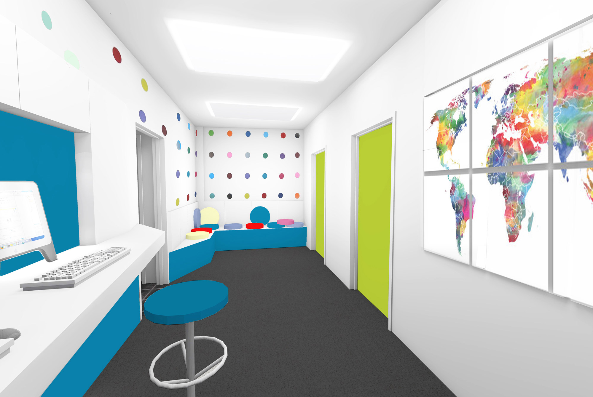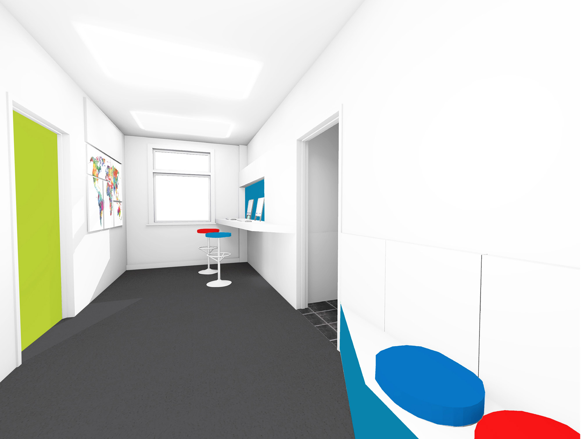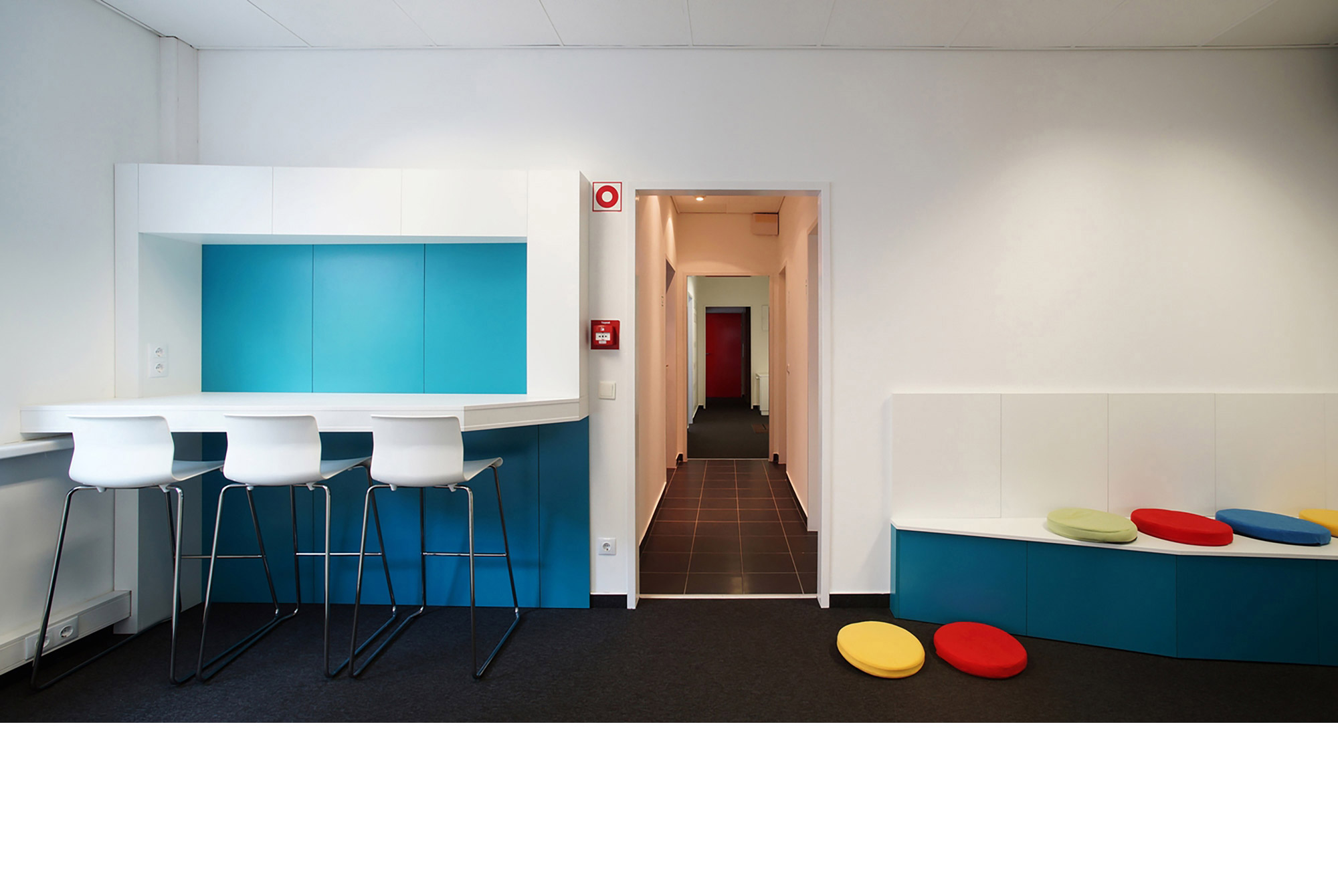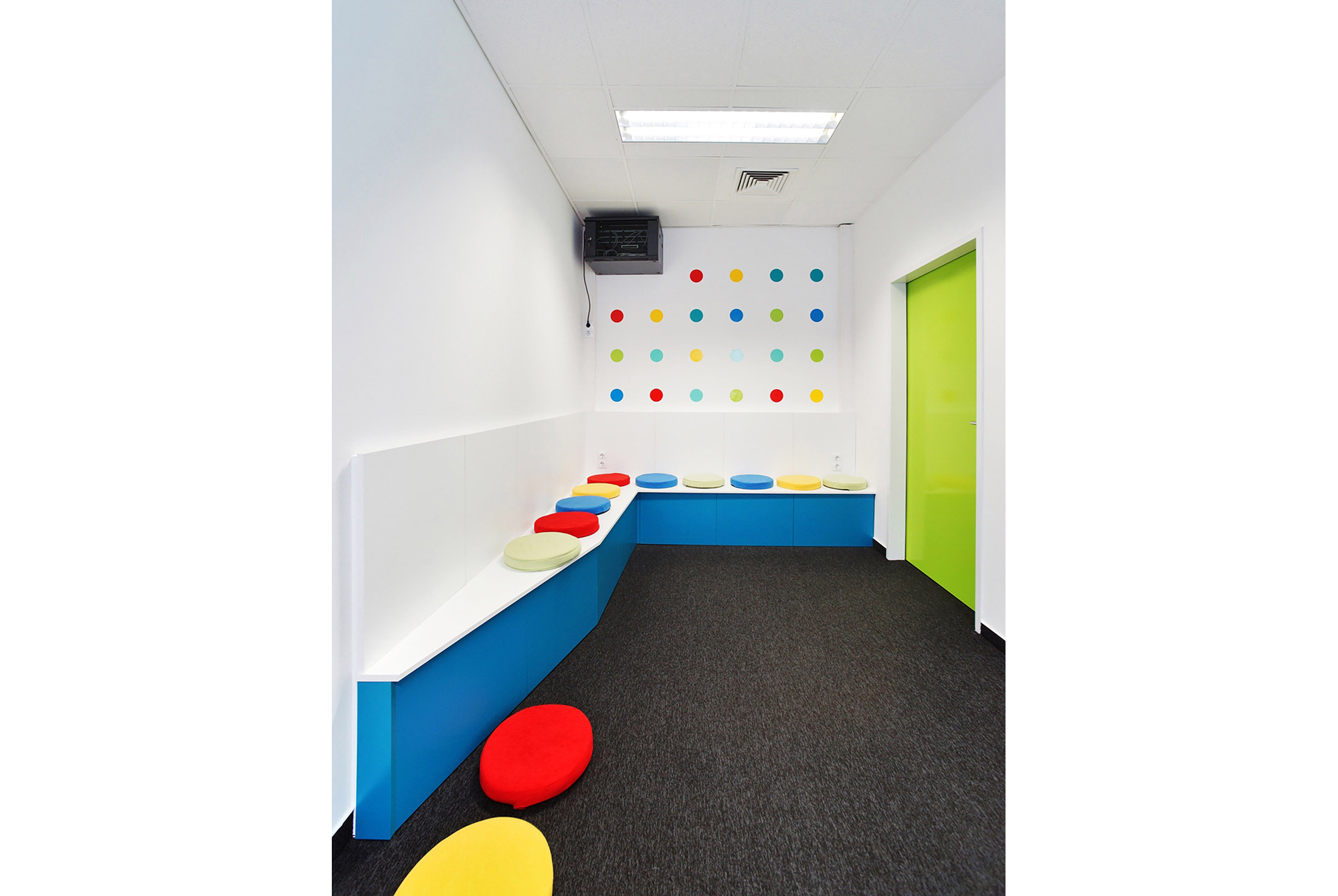 Egy nyolcvanas évekbeli irodaház bérelt helyiségeit hangoltuk a mai igényekre belsőépítészeti és arculati szempontból, egy soknemzetiségű, fiatalokat megszólító nyelviskolában. A helyszín jó példa arra, hogyan lehet kevés beavatkozással, a színek, grafikai elemek játékos variálásával, low budget keretből is vidám, kortárs légkört teremteni.
