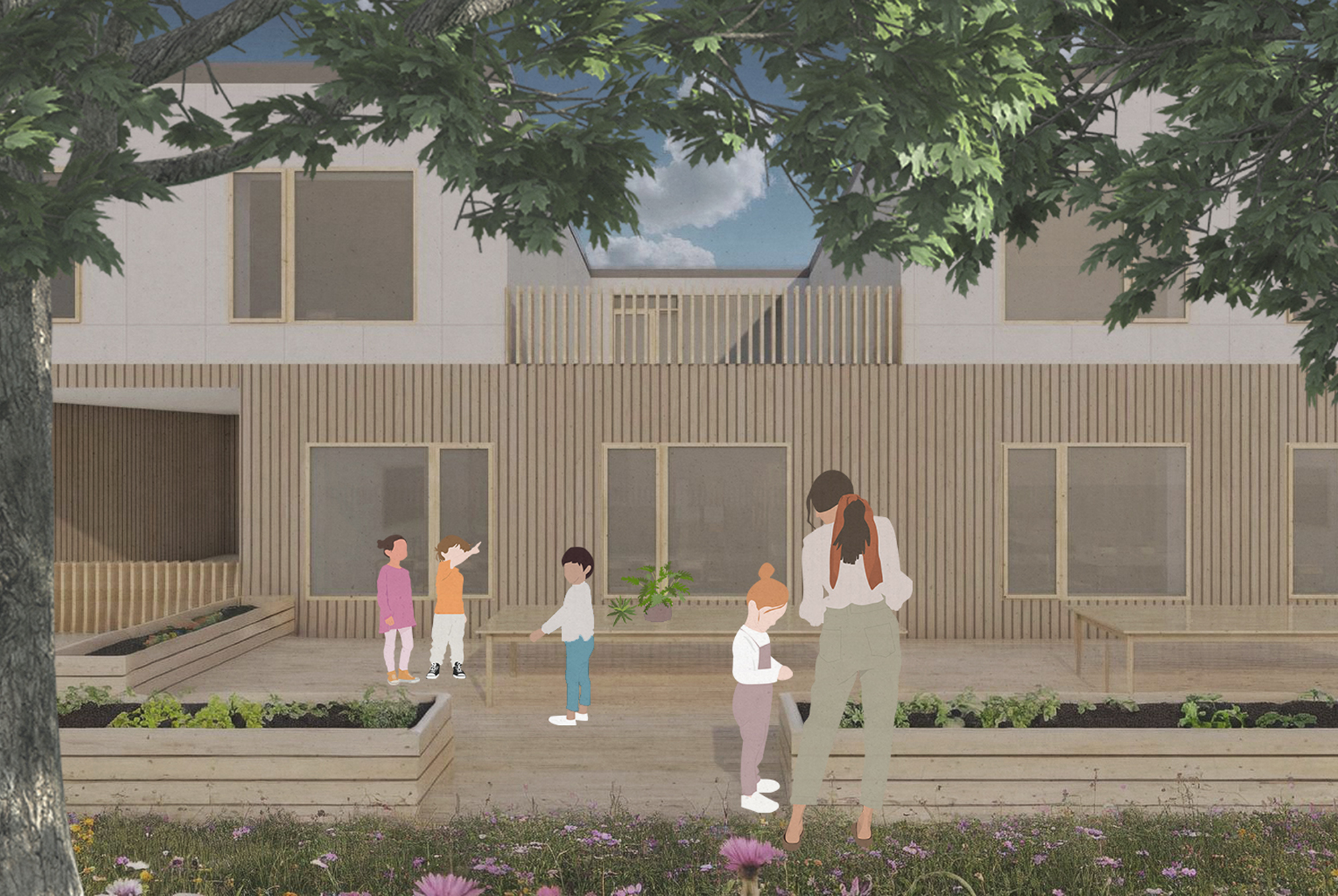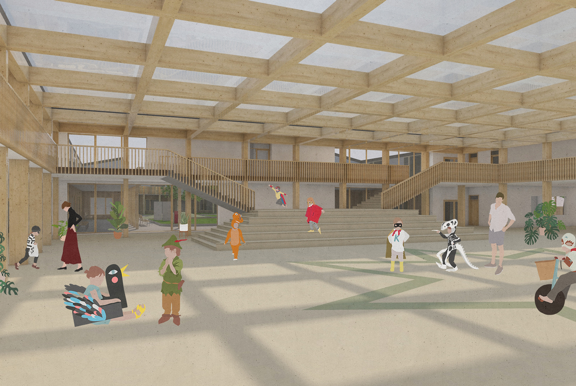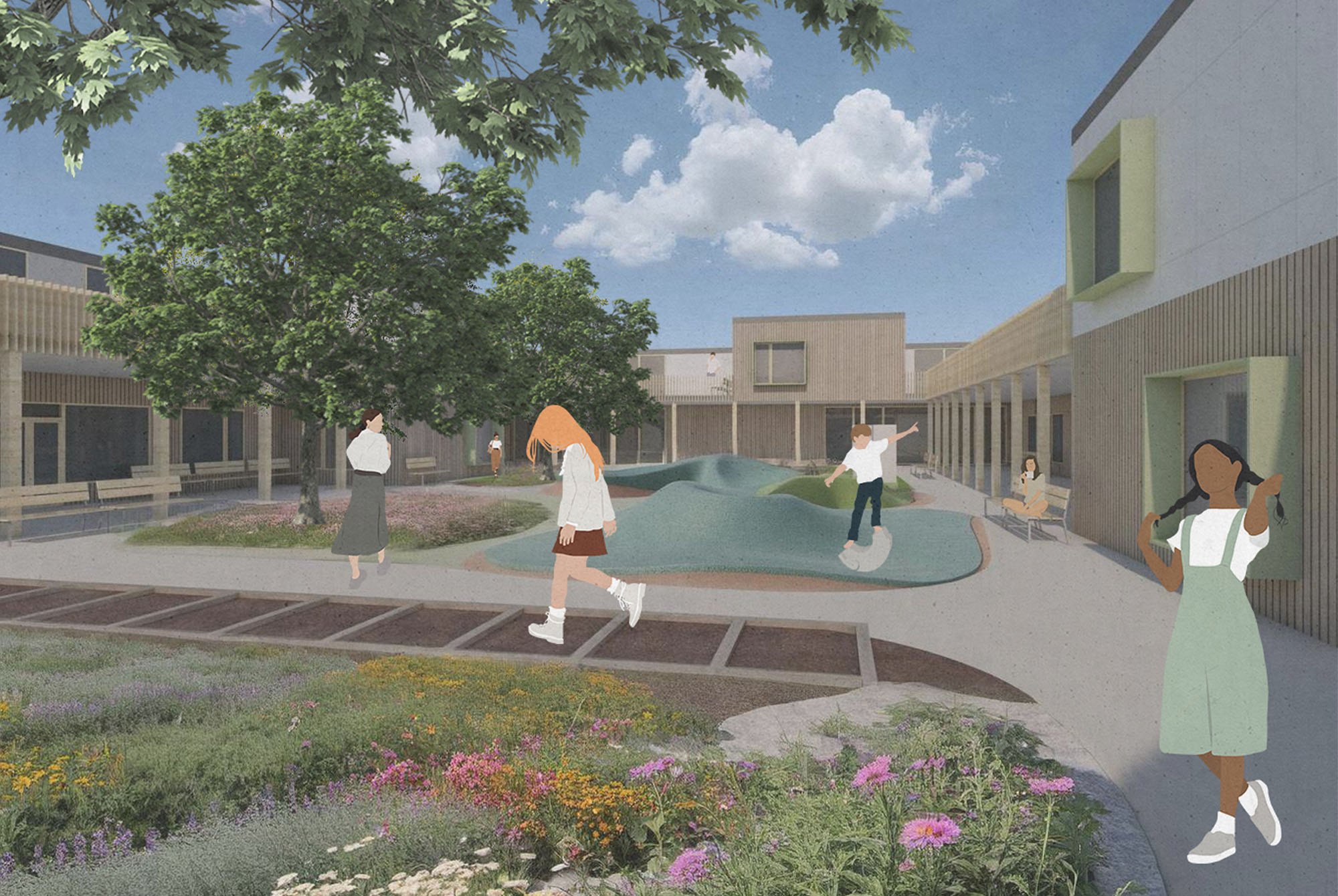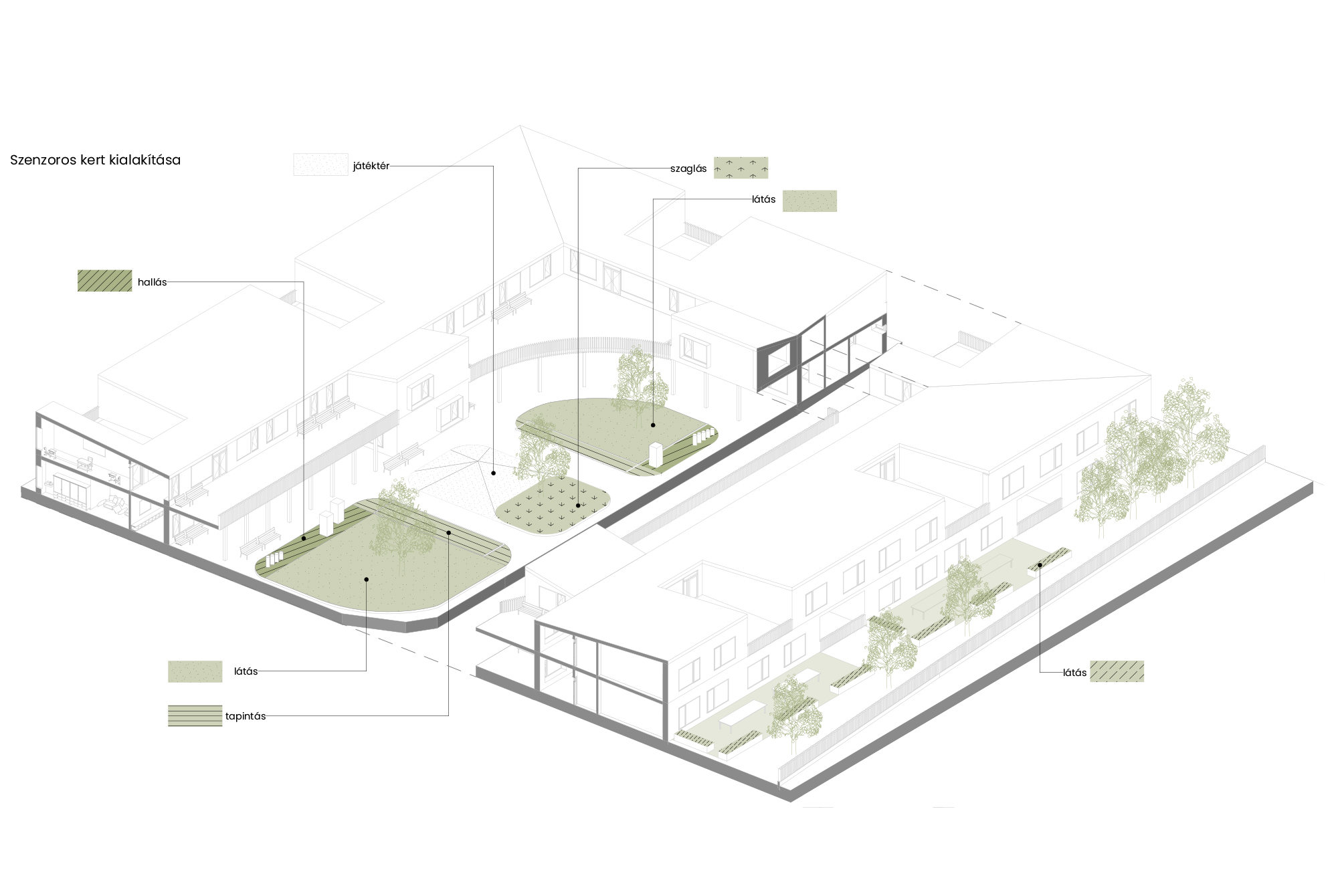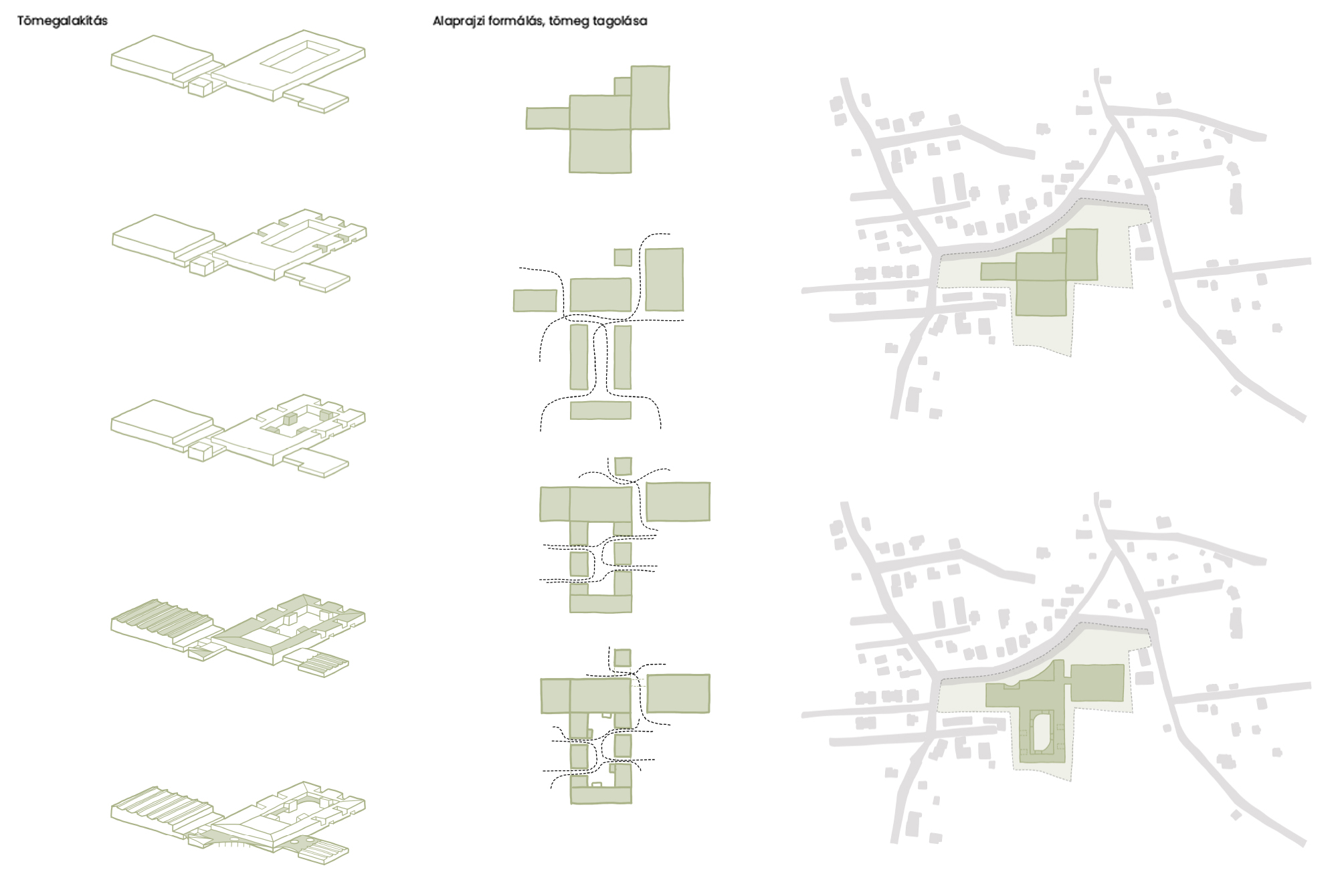 A tervezett telepítésben célunk volt a különböző funkciók elszeparálása, amelyek mégis egy egységet tudnak alkotni. Az így összeállított téri világ központi eleme a közösségi tér (aula), kert- és udvar kapcsolataival egy összetett organikus rendszerként működik, amelynek önálló identitású terei és azok eltérő kapcsolati minősége adja a teljes egészet.