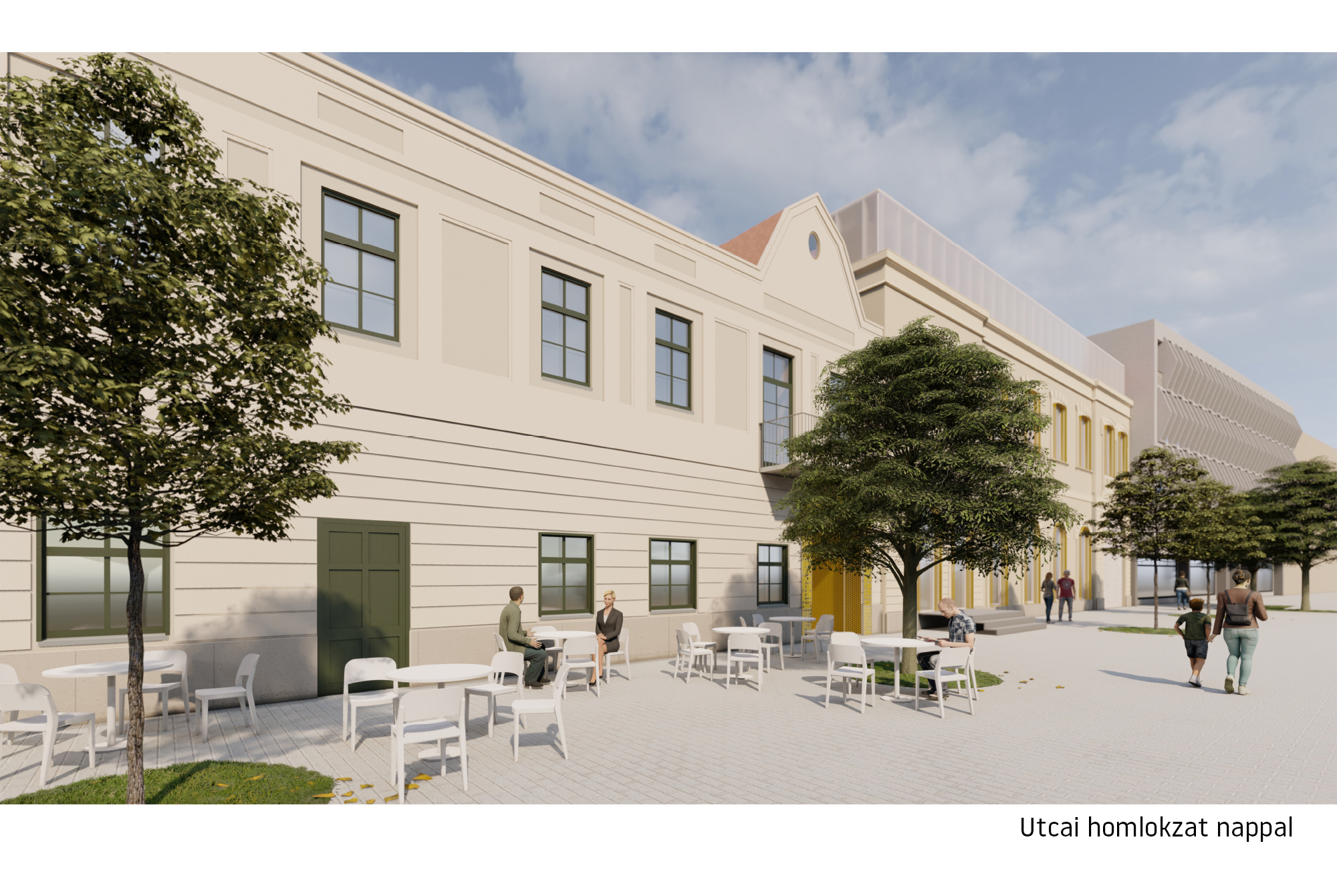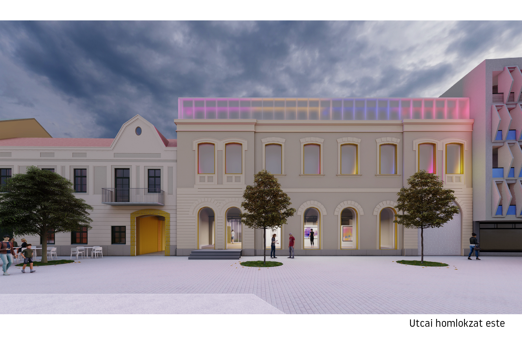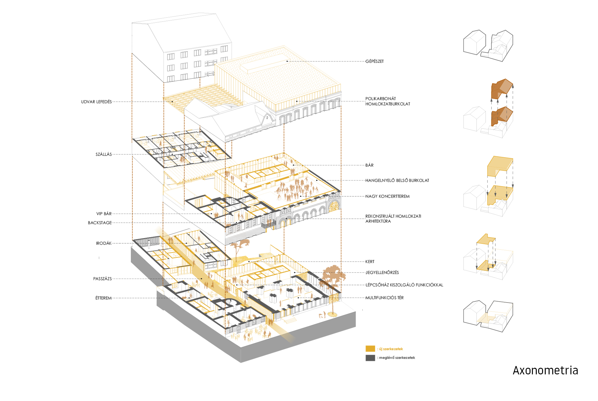A tervezési területen három különböző jellegű épület található. Koncepciónk alapelve a beépítés jellegének megtartása és a meglévő épületek értékes részeinek felhasználása, felújítása és a meglévő utcakép megtartása, mind műemléki, mind városképi-, mind fenntarthatósági okból. Az új funkció beillesztésével járó új épületrészek kialakításánál fontos szempont volt a visszafogott, mégis határozott kortárs megjelenés. A tervezési területen a kortárs elemeket fontosnak tartottuk egy rendező elv mentén kialakítani, amihez a zenedoboz analógiáját használtuk. Mindemellett a funkciók elhelyezésénél fő szempont volt, hogy a meglévő épületek szerkezetét, alaprajzi adottságait figyelembe véve a lehető legkevesebb bontással és átalakítással helyet kaphassanak az új funkciók.