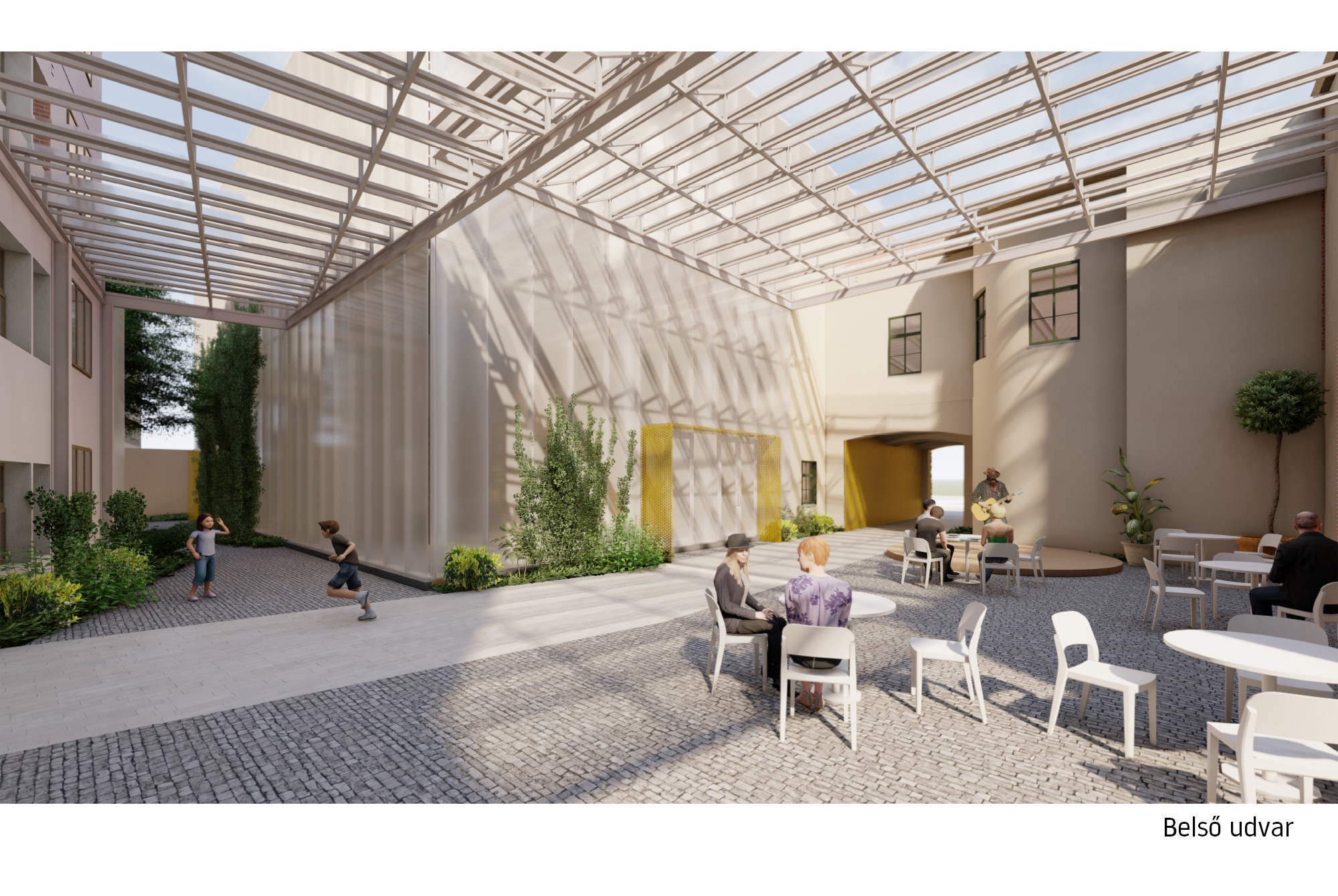 A kialakított belső udvarnál a térlefedés folytatja az új épületrész anyaghasználatát, biztosítja a természetes szellőzést, megoldja a csapadékvíz elvezetését és segít az udvaron zajló rendezvények hangcsillapításában is.